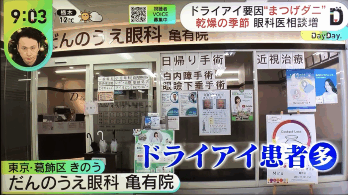 番組のコーナー前半では、佐藤院長がこの季節に増える「ドライアイ」について解説しました。空気の乾燥やエアコンの使用、パソコンやスマートフォンを長時間見ることでまばたきが減ることが、ドライアイの原因の一つです。目の乾きやかすみ、不快感などの症状があり、重症化すると炎症を起こすこともあります。